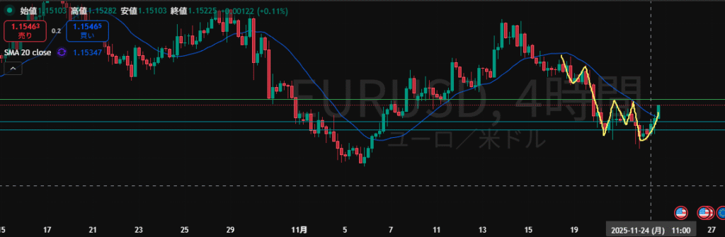 ・日足と4H足が同時に安値を抜けたので4Hで攻防ラインが想定される。狙うなら攻防ライン抜けの4H戻り売りか