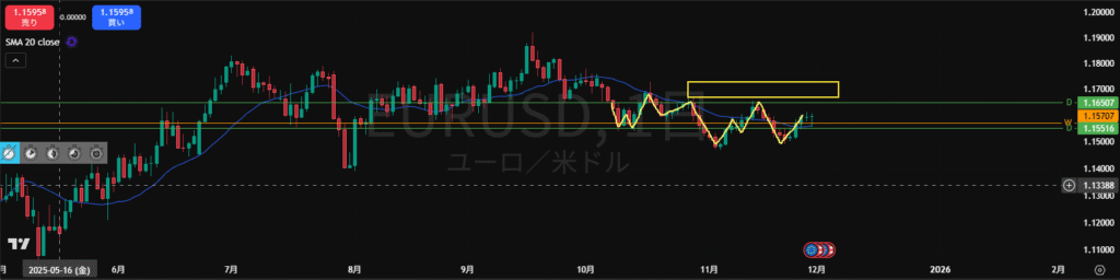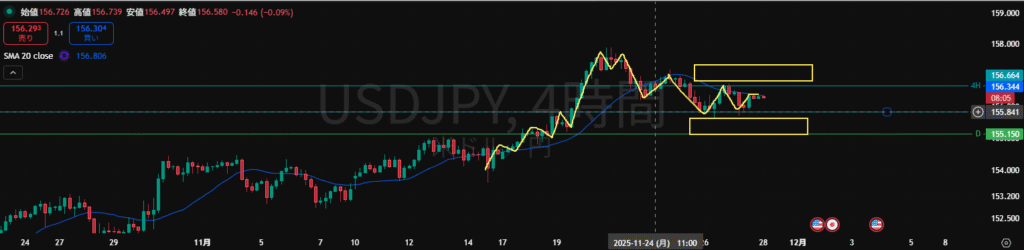 ・上の水色の水平線が売り抑えライン。下が買い支えライン。トレンドは出ていない。MAは上にあり抑えられやすい状況。