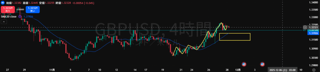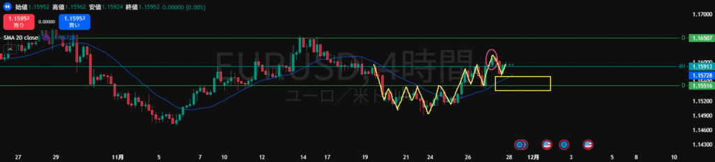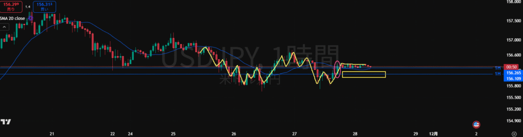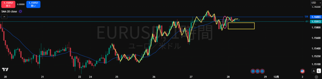 ・4H足は押し目買いラインに到達しているが1Hでは高値を切り下げてきているので攻防ラインを想定か。