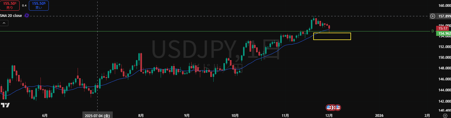 ・緑の水平線は押し目買いライン。MAは上向きで買い支えとして機能しやすい。日足押し目買いライン付近まで落としてきた