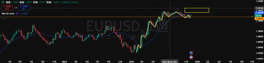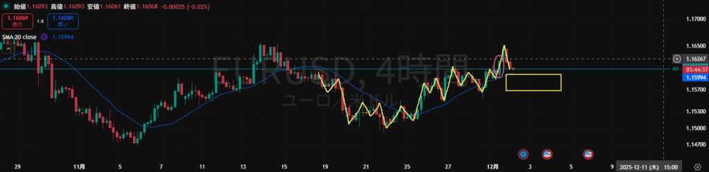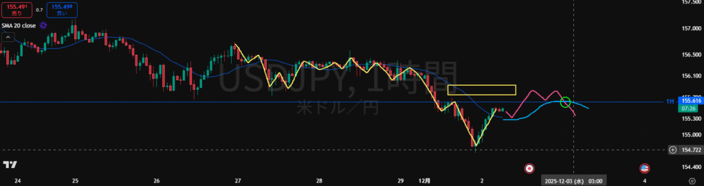 ・オレンジの水平線が戻り売りライン。MAはほぼ水平。ローソク足の上にあり売り抑えとして機能しやすい状況