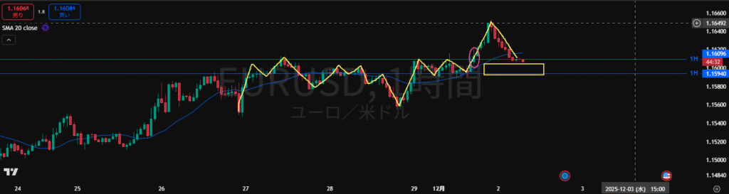 ・週足はMAに抑えられているかなという状況。日足はどっちともとれる状況。4Hは戻しもつけずに上がった分下がってきている。4Hの目線的には上だけど売りも強くはいっていて買っていこうと思える状況ではないので様子を視る。