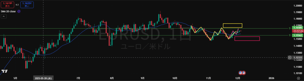 ・下の緑の水平線は押し目買いライン。MAは上向きで買い支えとして機能しやすい。わかりずらいがピンクのダウのように1回ダウを挟んできているようにも見える。そうすると上の水平線が戻り売りラインになる。こう見ている市場参加者も少なからずいそう。その場合、ピンク丸が卵になる