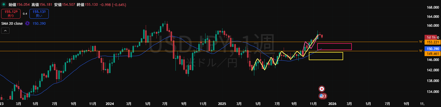・ダウが2通り。上のオレンジの水平線がピンクダウの場合の押し目買いライン(ピンクの四角に押し目買い勢力)。下が黄色ダウの場合の押し目買いライン(黄色い四角)。MAは上向きで買い支えとして機能しやすい