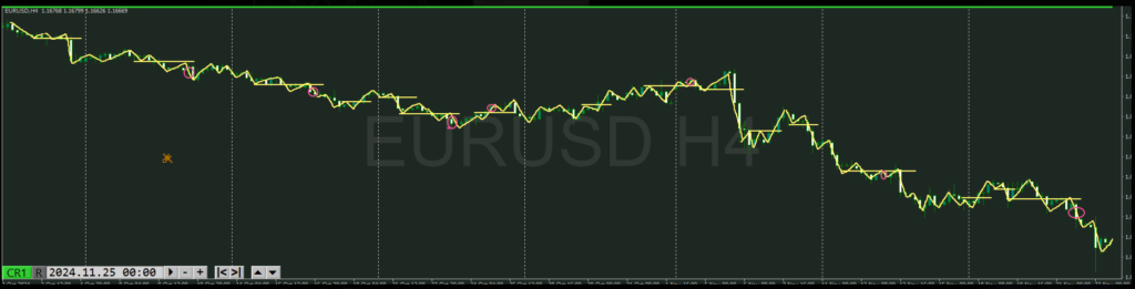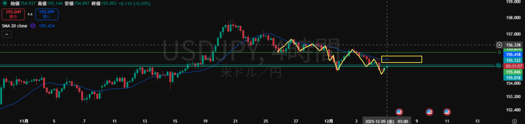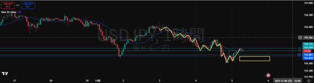 ・水色の水平線が戻り売りライン。MAは水平で売り抑えとして機能しやすい。日足の押し目買いラインと4Hの戻り売りラインが重なっている。