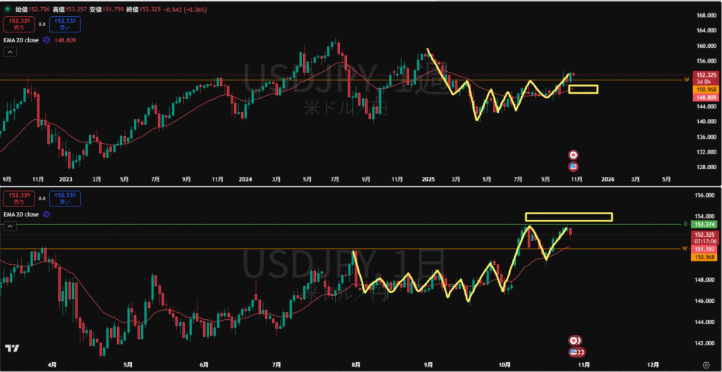 日足、週足は依然上向きだが日足は高値を前回高値できれいに抑えられてこようとしているので、1H足が下落トレンド出れば売っていけるのか。