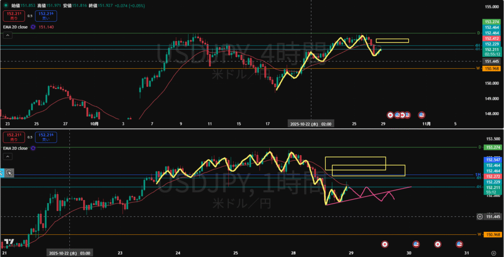1H足も下落後一旦止められ調整に入るか?直上には1Hと4Hの戻り売り勢力とMAがあるので止められやすい。