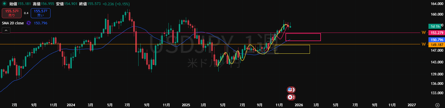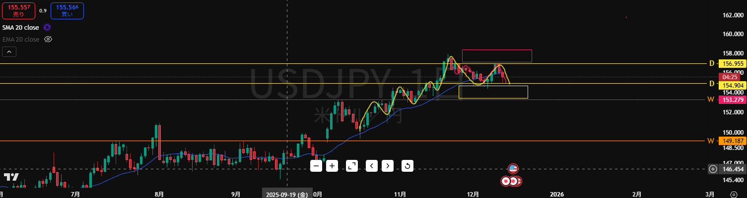 ・上の黄色のラインが売り抑えライン。下が買い支えライン。MAは緩やかな上向きだけど、ローソク足が下抜いているので売り抑えとして機能しやすい状況