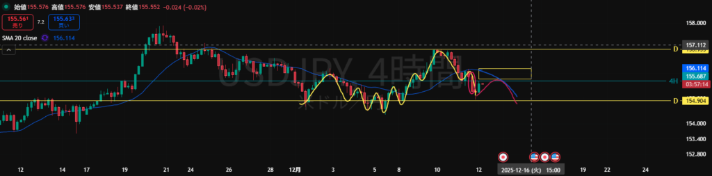 攻防ラインを想定していたが、4Hの水平線を上抜いて4H足のMA付近まで上昇してきた。日足で視ると、高値切りさげて、安値も切り上げて、MAはまだ上向きだけどローソク足は下にいる。というよくわからない相場状況になった。結局どっちなのか結論出ず。