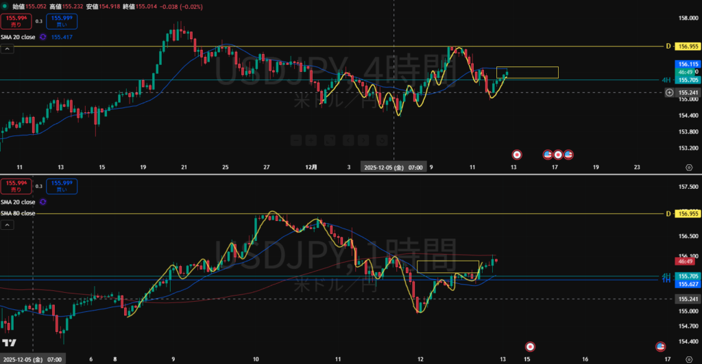 これで4H足のMAも上抜いて上昇トレンドに転換してくれば週足から1H足まで目線が上になるので1H足で押しを待って買いを検討したいところ。