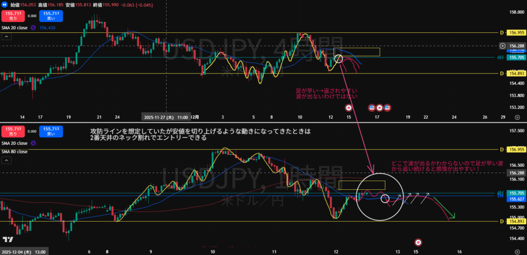 ・日足の今の環境がわかりずらい。ピンクダウもあるだろうと視ていたけど、自分が思っていた高値は実体で上抜いてしまっているので、そう考えると上昇の波の調整中で上とみている市場参加者のほうが多そうだし、MAは下抜いてきているのでこのまま下落してくる可能性ももちろんあるわけだし・・というわけで日足はどちらもあるという中で4Hの優位性で考えていくと、1Hと同時に安値を割ってきているので攻防ライン抜けを待つ。