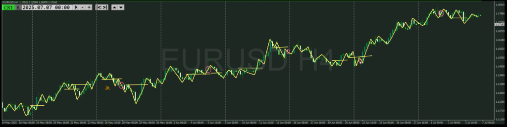 ・水色の水平線が戻り売りライン。MAは下向きで売り抑えとして機能しやすい。ピンクの丸がTTS