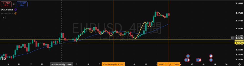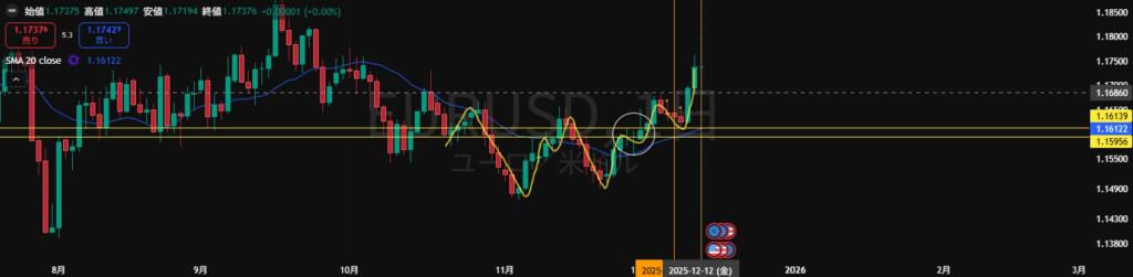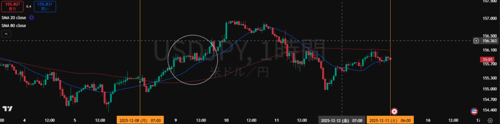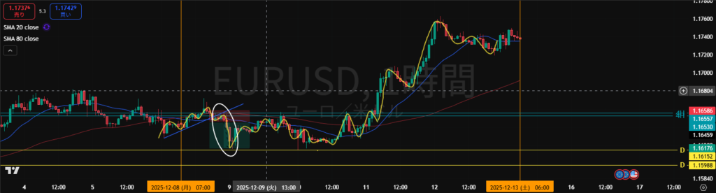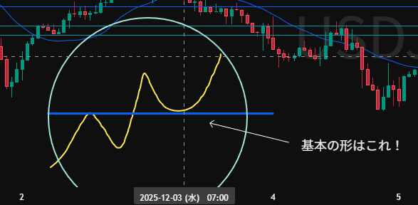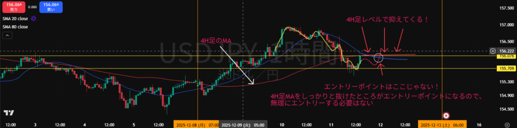 ・4H足の高値を超えて存在確認をしたとしても、4HMAが上から押さえつけてくるような場面ならば、エントリーポイントは1H足のネックライン越えではない!4HMAをしっかりと超えて(=直感)こないと戻される可能性が高い!