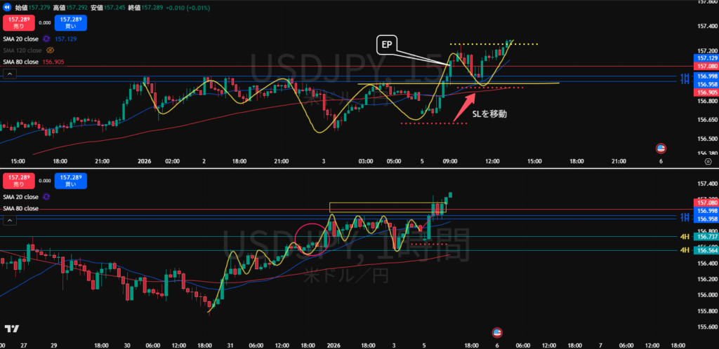 レジサポになって高値も超えてきたので「おー良かった」と思いながらSLを引き上げた