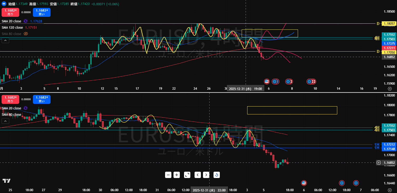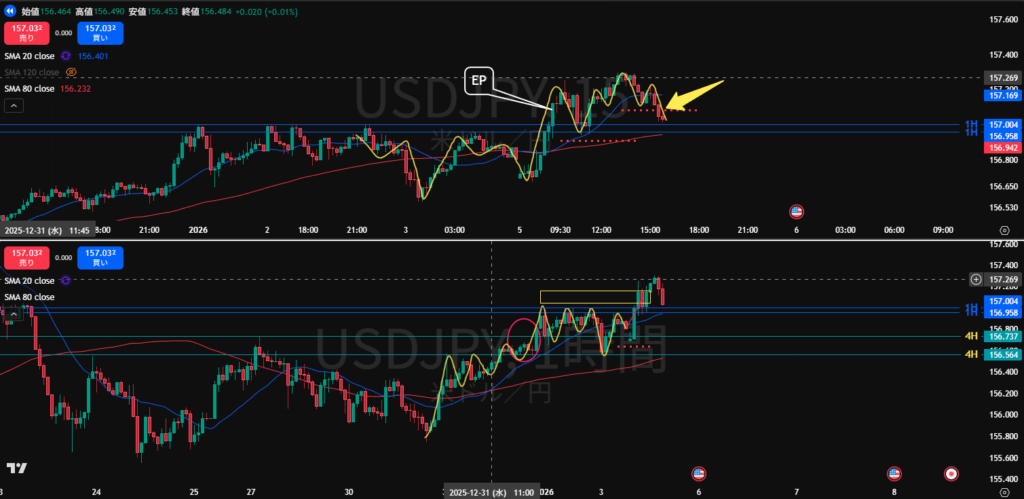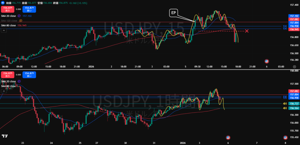 ・4H下降トレンド中だけど、日足のMAと4HのMAに挟まれて戦争中なので、しっかりと上か下に抜けるまで手が出ない。