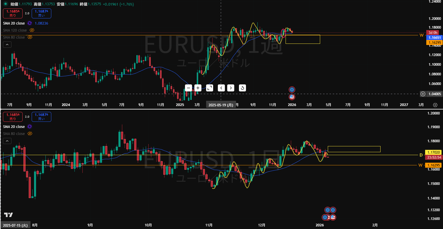 ・オレンジの水平線は上が売り抑え、下が買い支えライン。前回高値を超えられず陰線を付けてきているので上昇への勢いは弱くなってきているように見える。