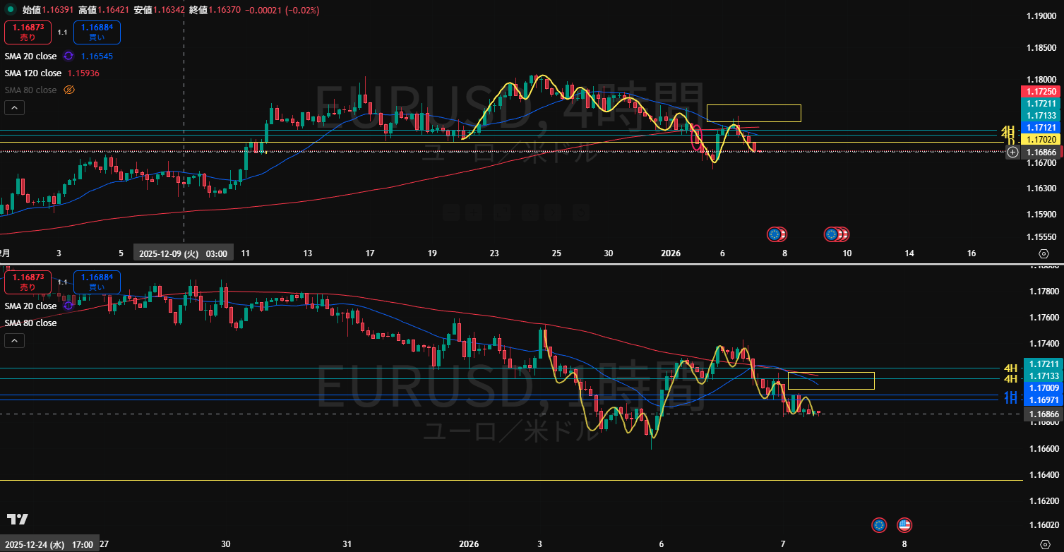 ・青の水平線が押し目買いライン。4HのMAをわずか上抜いた後戻してきている。下には押し目買い勢力がいる。MAも上向きで買い支えとして機能しやすいところ