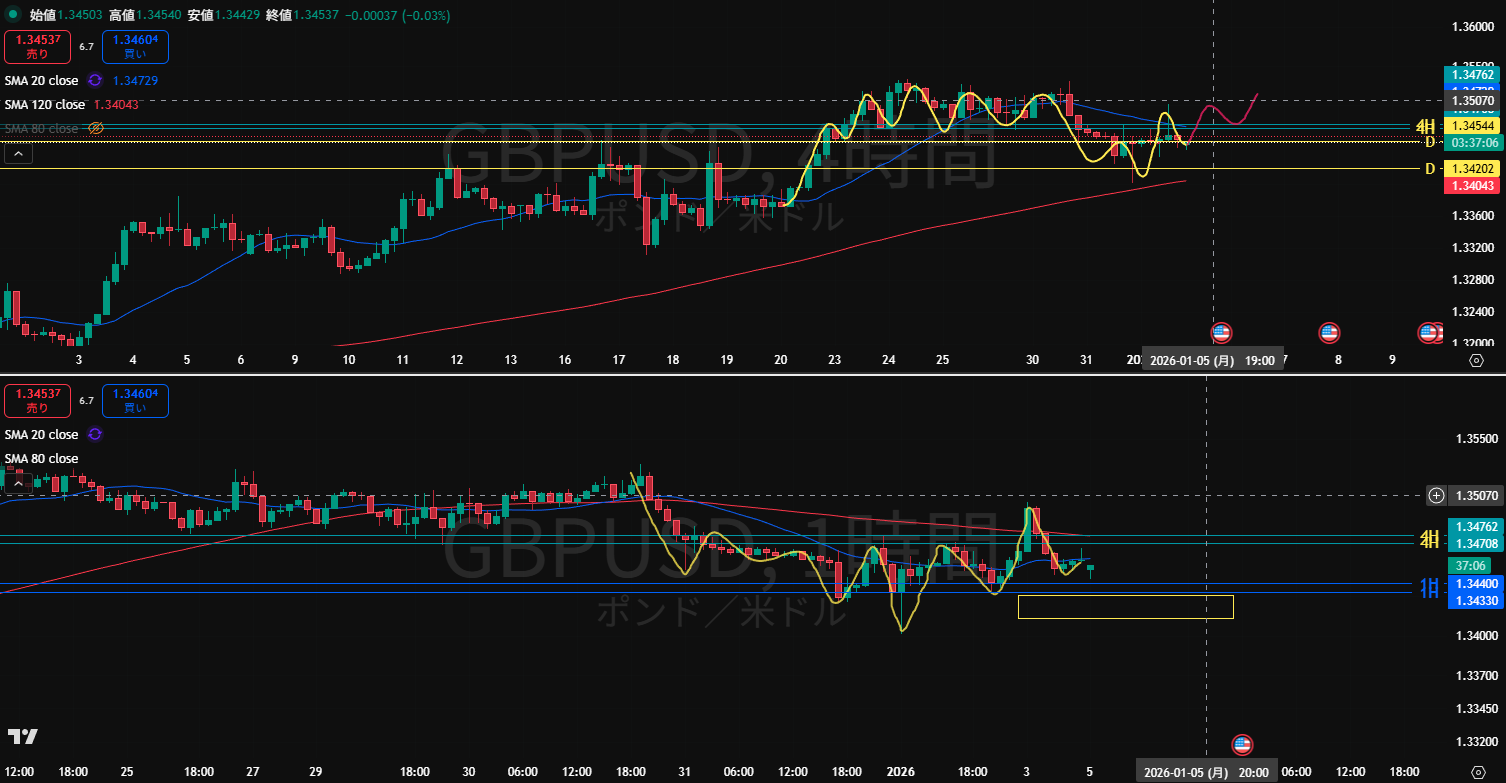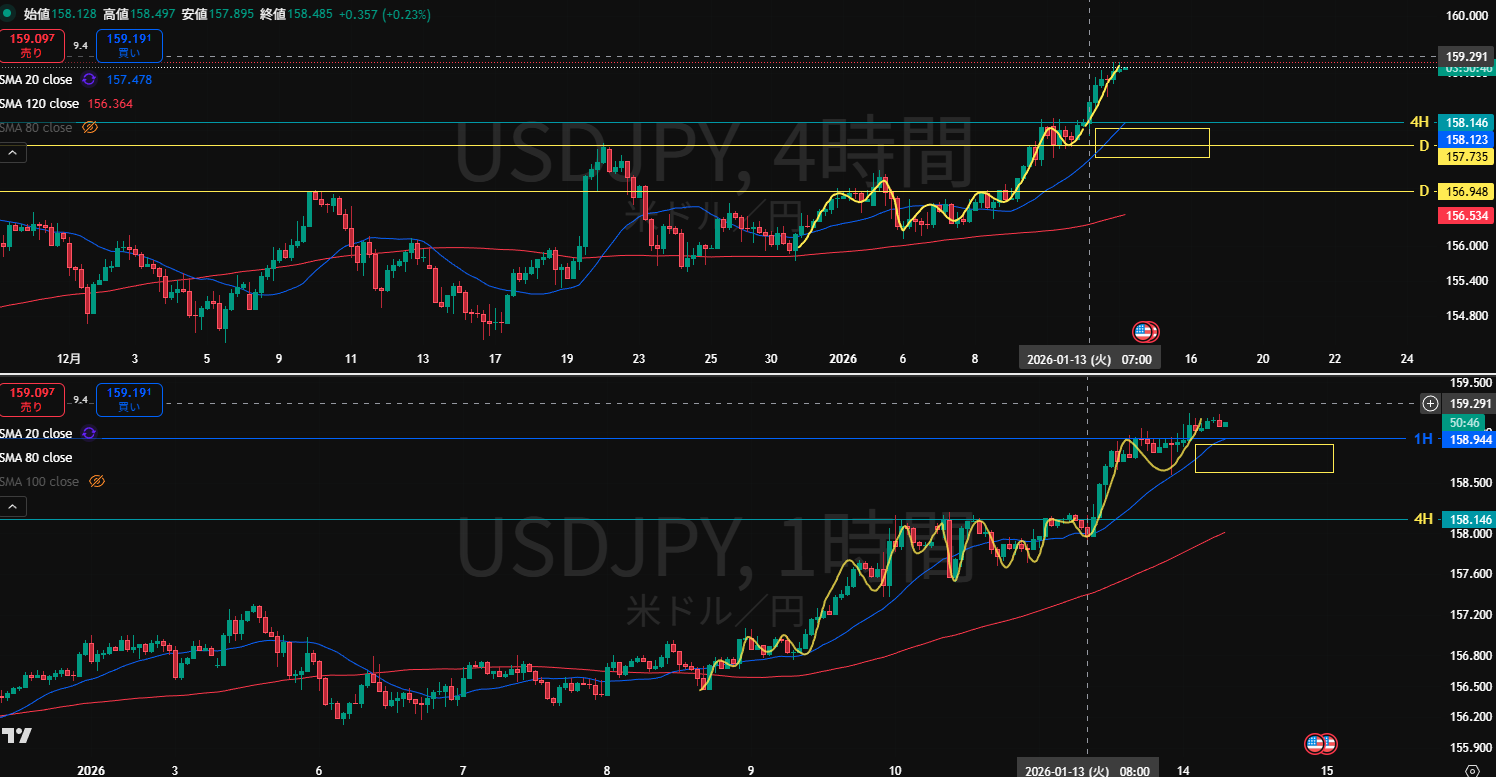 ・オレンジの水平線が押し目買いライン。MAを上抜いて上昇の勢いは強そうだけどまだTTSになるかはもう少し時間経過を待ちたいところ