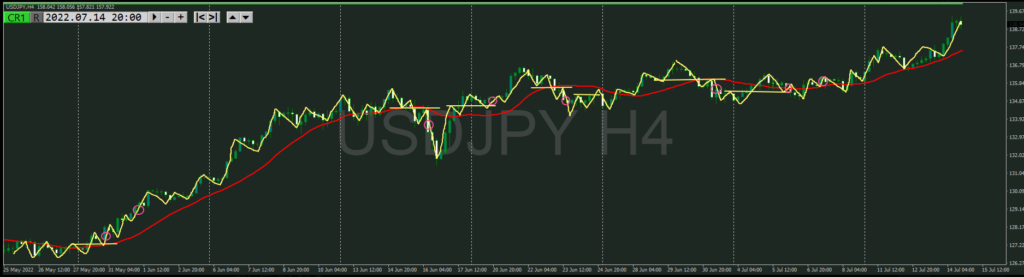 ・黄色のラインが戻り売りライン。上には戻り売り勢力がいる。MAは横ばい。MAを下抜いてたところでヨコヨコしてる