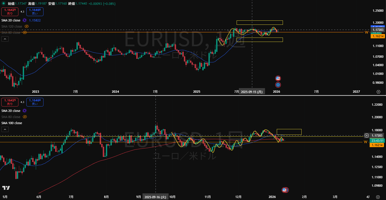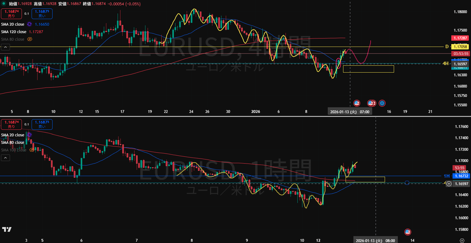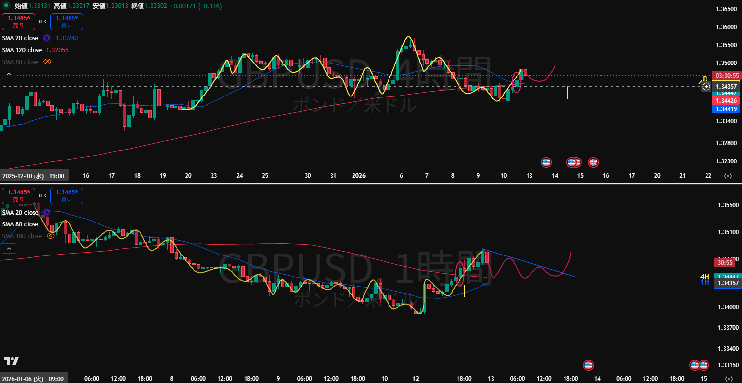 ・水平線を2本引いた。直近高値に合わせたのが下のラインだけど、もう一個手前の高値に引いた上の水平線のほうが意識されそうかなと思う。下には押し目買い勢力がいる。MAも上向いてきて買い支えとして機能しやすい。