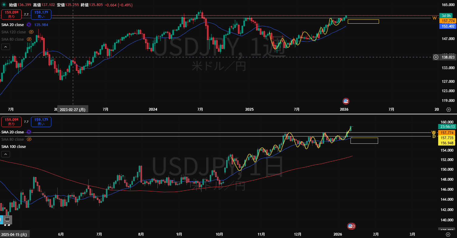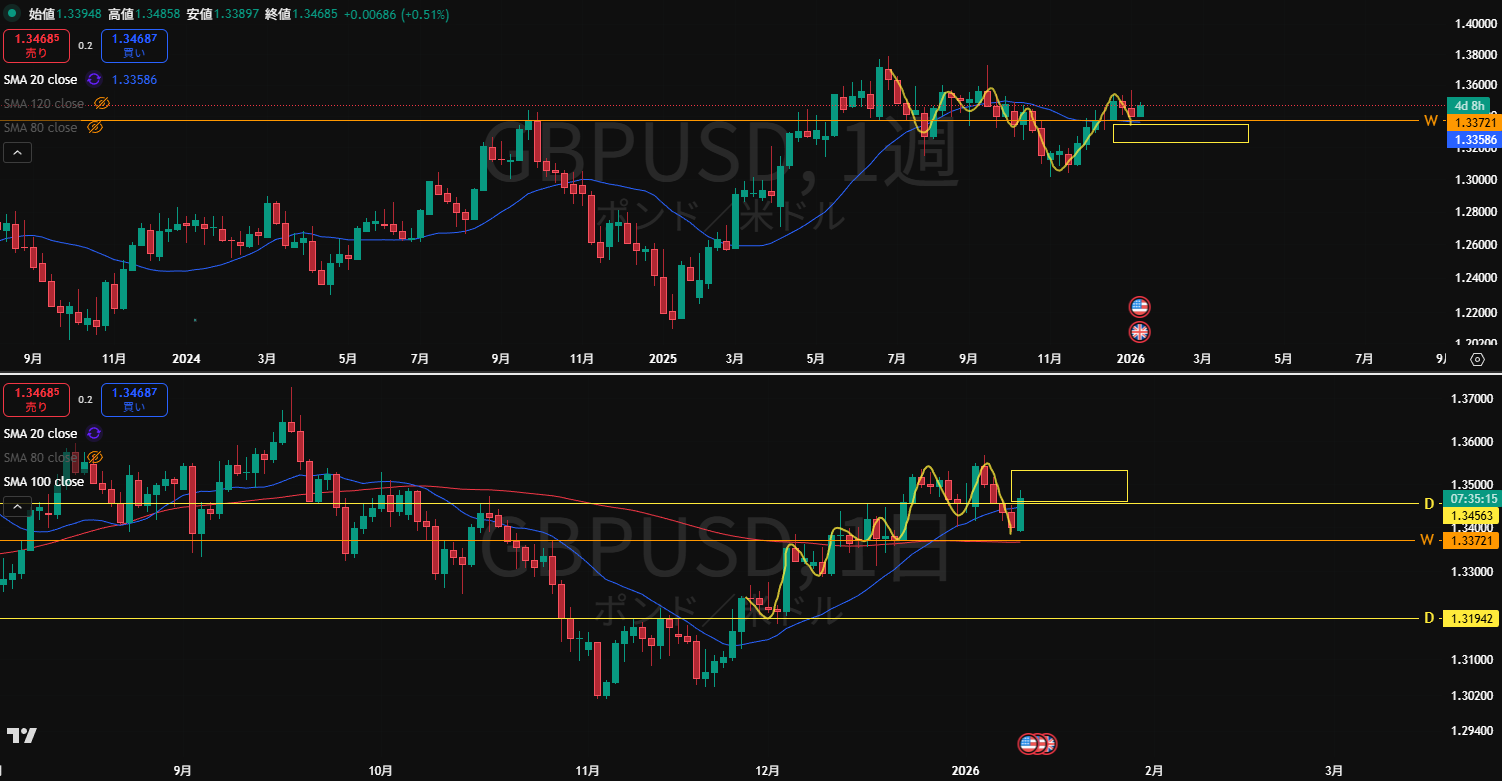 ・オレンジラインが押し目買いライン。MAは横ばい。直近だけを見ると押し目買い入りそう、大きく見ると調整中に見える