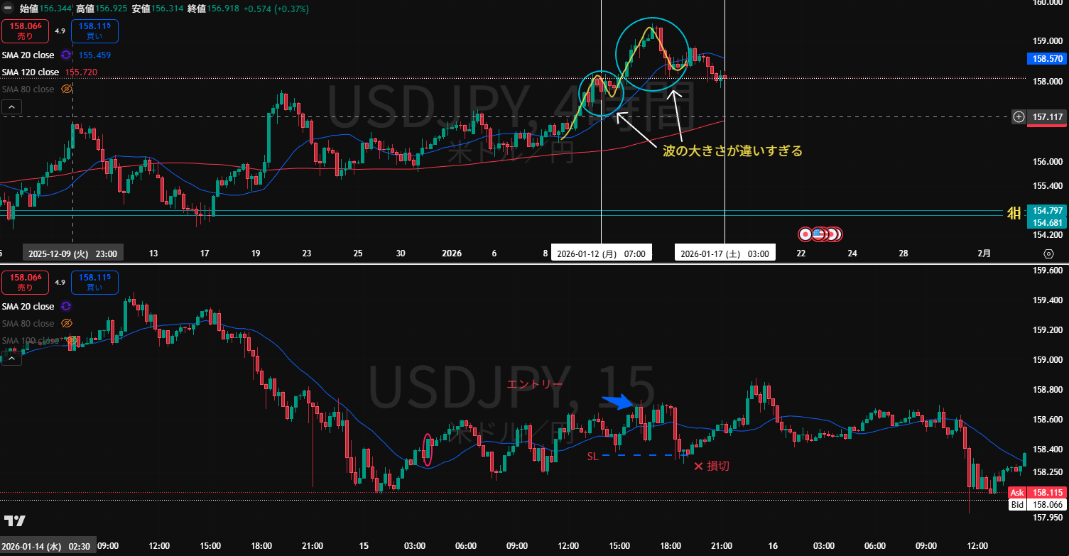 4Hの押し目買いを狙ったトレードだったけど、押し目をつける過程において、上昇に掛かった時間に対して、押してくる角度がきつい。ということは売り圧が上昇の時の下位の圧よりも強いということ。それに加えて、4Hで押しを付けたところはすでに4HのMAを下抜いているので、MAが抑えてくる。それを考慮するとエントリーするべきところではなかった。