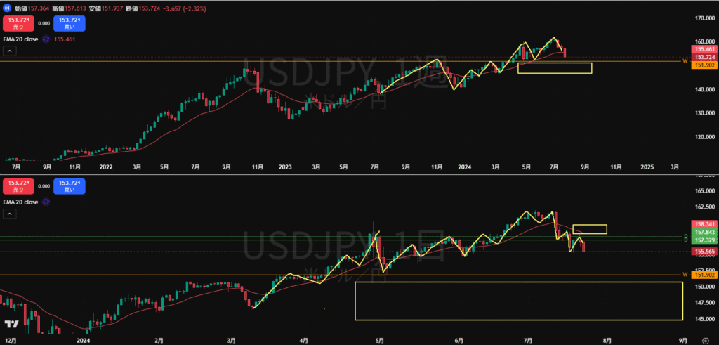・買い支え勢力のいる週足の水平線(オレンジ)で止められている状態。ここを割ってくればトレンドが終わる場所。