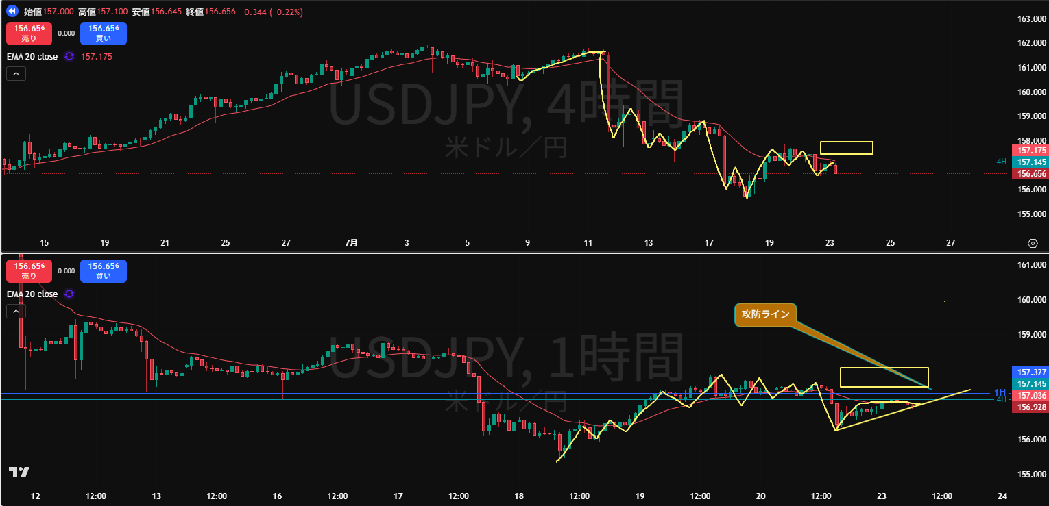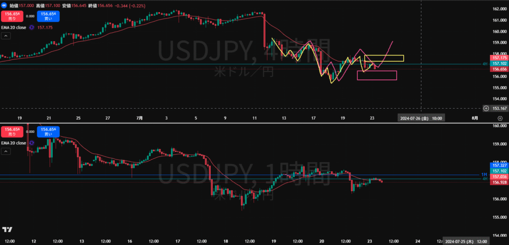 ・戻り売り勢力がいる4Hの水平線(水色)とMAにさえられるように下落してくるかというところ。1Hと同時に安値を割ってきたので攻防ラインが想定できる。