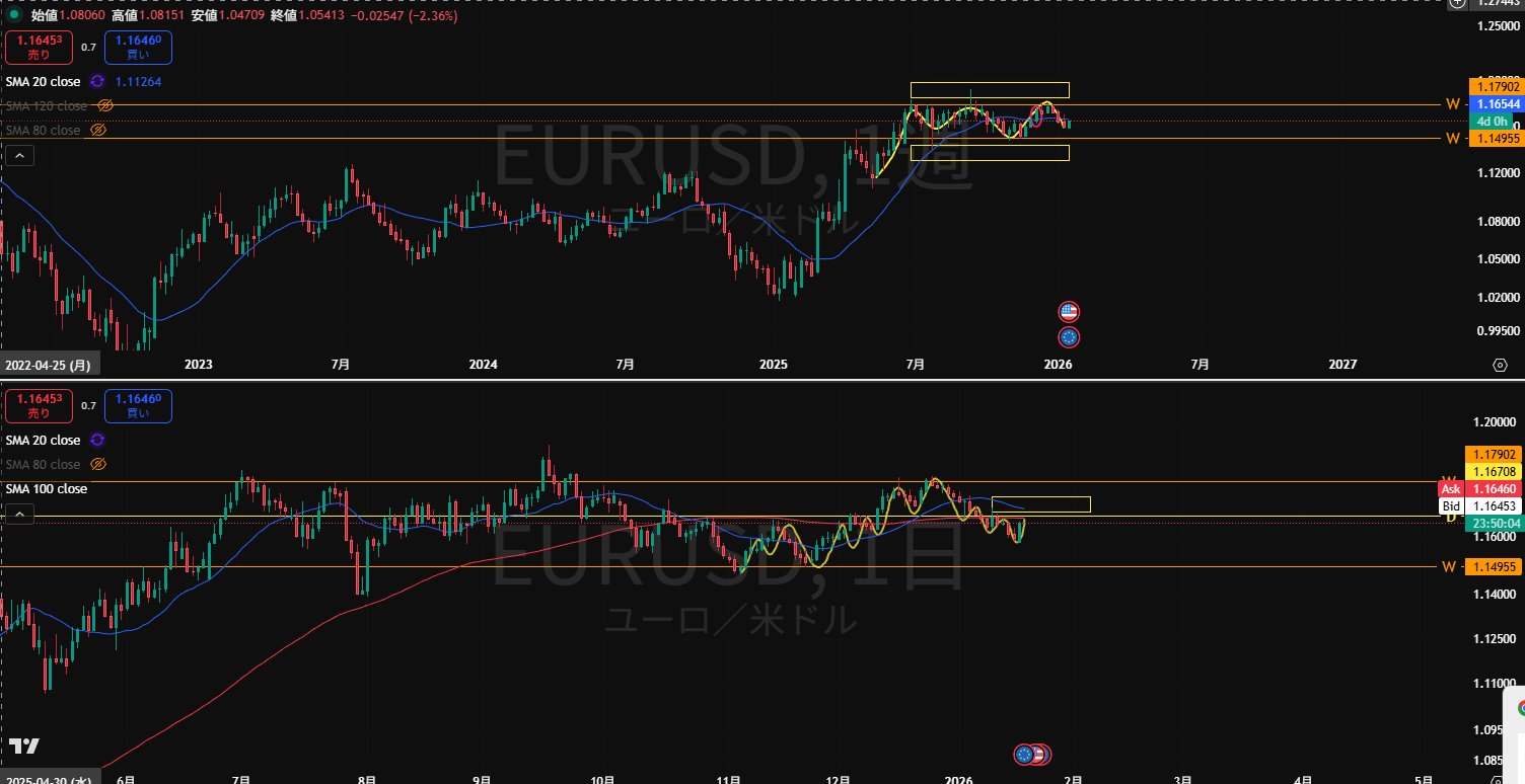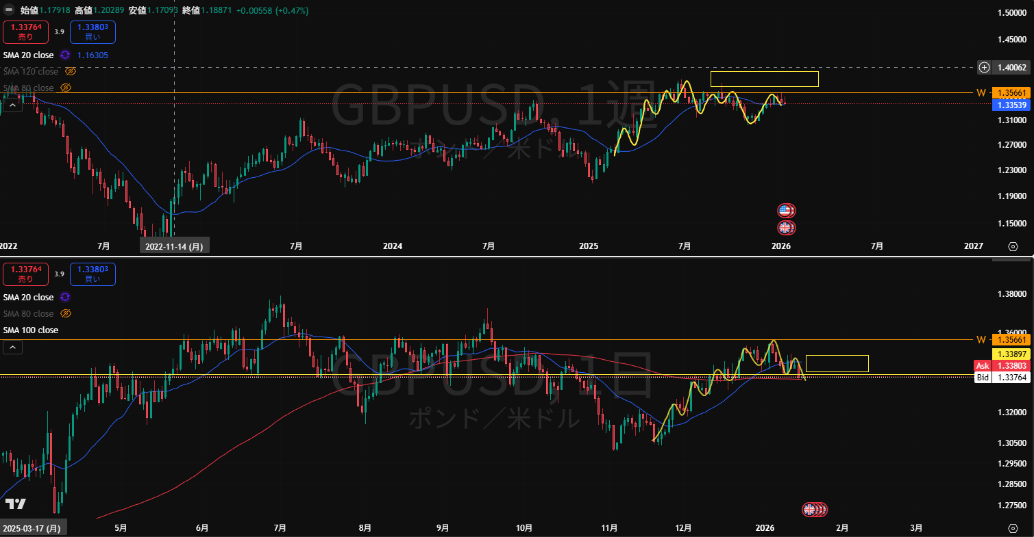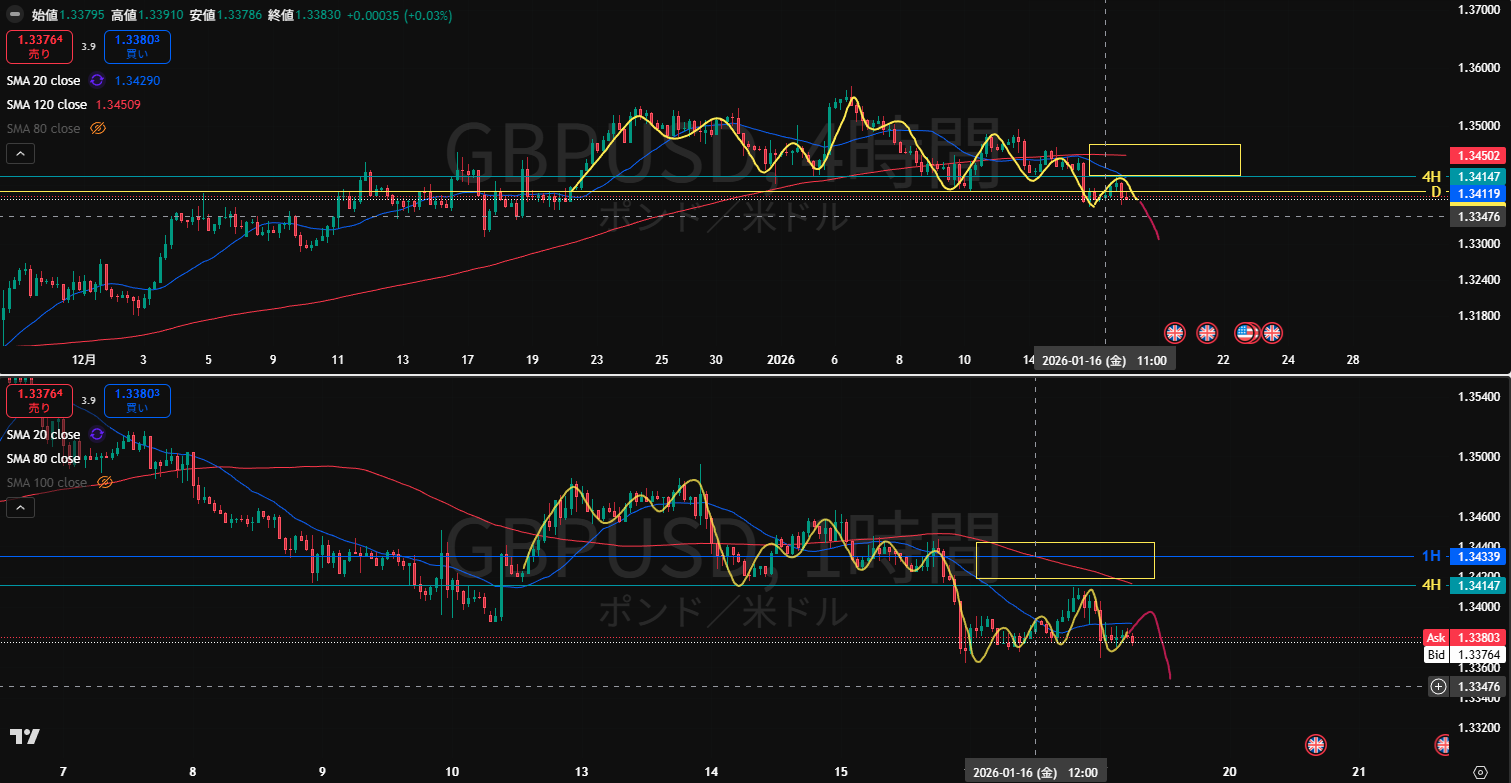 ・黄色のラインが売り抑えライン。上には売り抑え勢力がいる。MAは下向きで売り抑えとして機能しやすい状況。