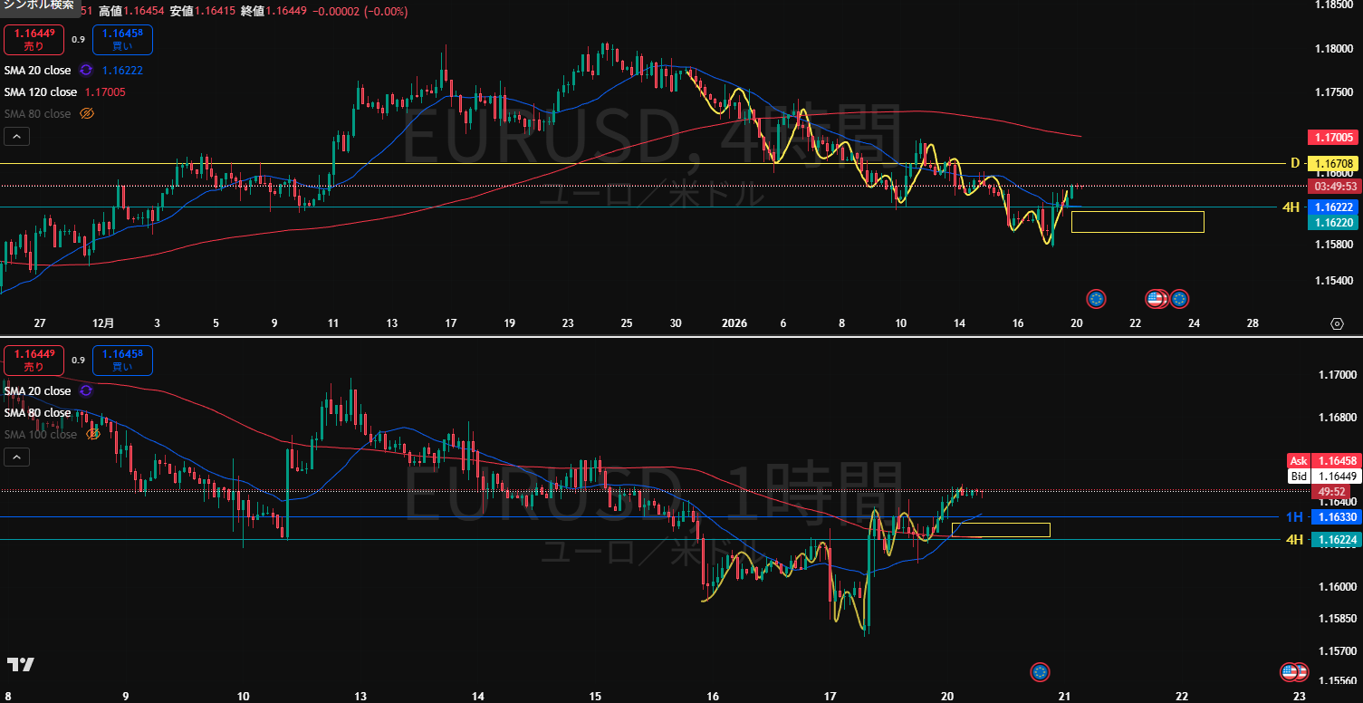 ・週足は目線上だけど売り抑えてられて来ているような状況でどちらもあり得る。日足は水平線とMAが重なり買いが入りやすい状況。4H足は戻り売りポイントにきていて波の形はきれいに視える。1Hは上昇トレンド中だけど上値を4H足の水平線でしっかり抑えられている感じ。以上を踏まえて、4Hの戻り売りポイントでしっかり押さえられて1Hの買い支えラインを割ってくるようなら売りを検討。4Hの水平線を上に抜けたら一旦するスルー