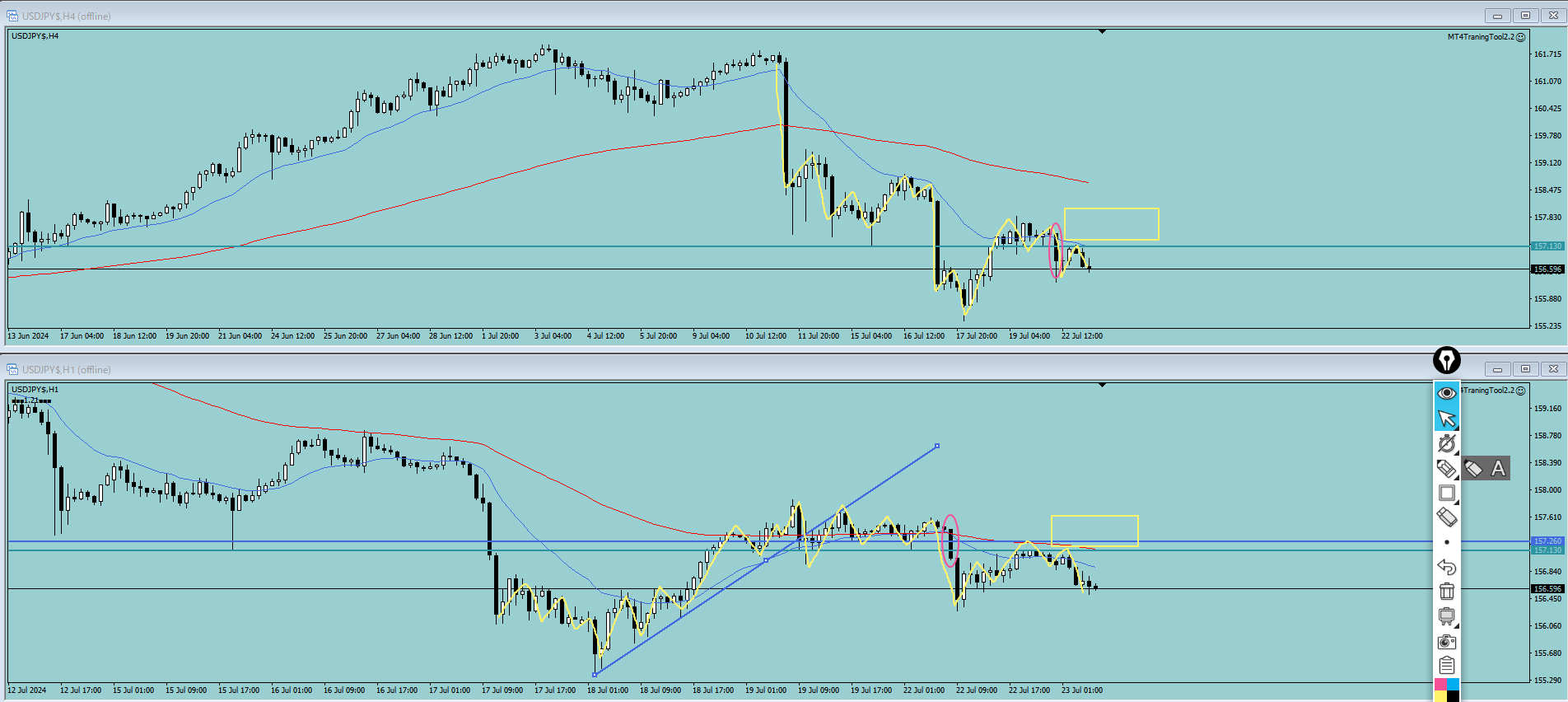 ・赤丸でTTSが出て目線は下に。その後4H足の水平線とMAに抑えられるように下落した。