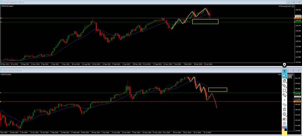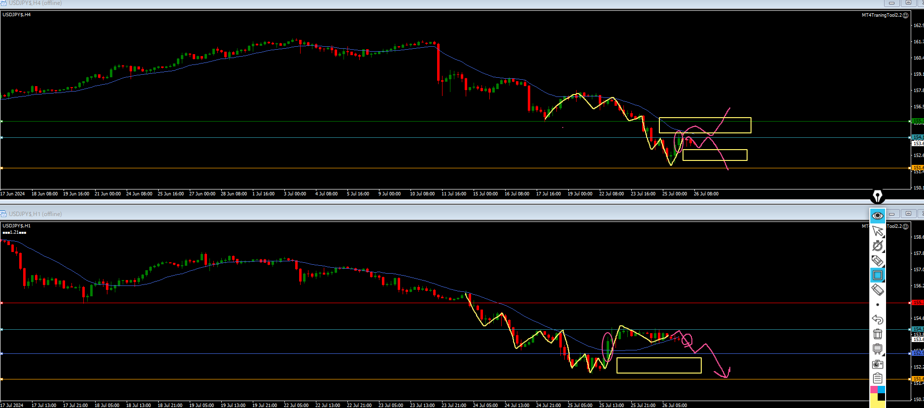 ・日足は安値を割って下落の波の途中。ピンクダウのようになり易い。そうすると黄色四角に戻り売り勢力がいるんじゃないの?となるので、緑水平線で確認していく。