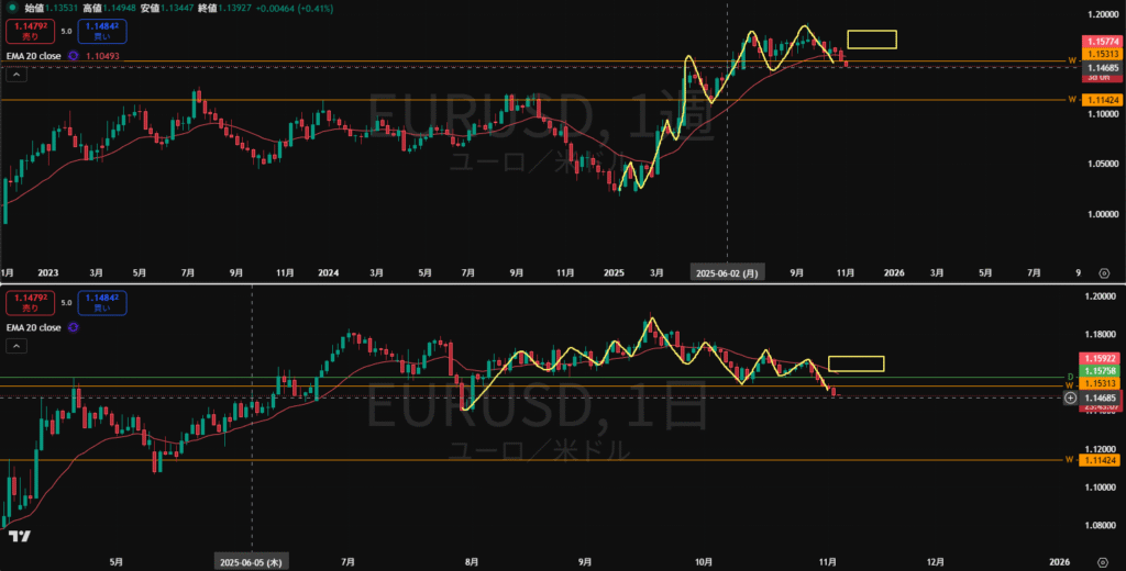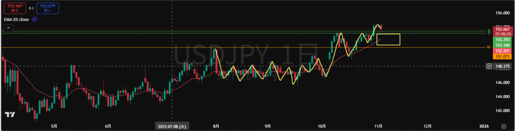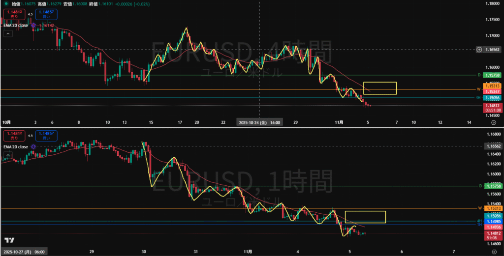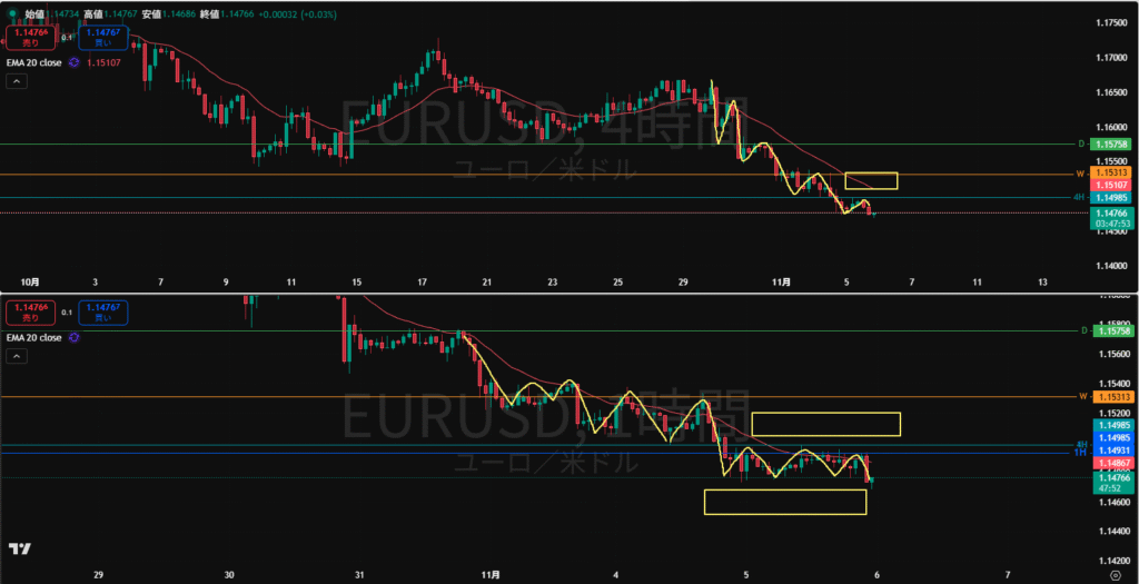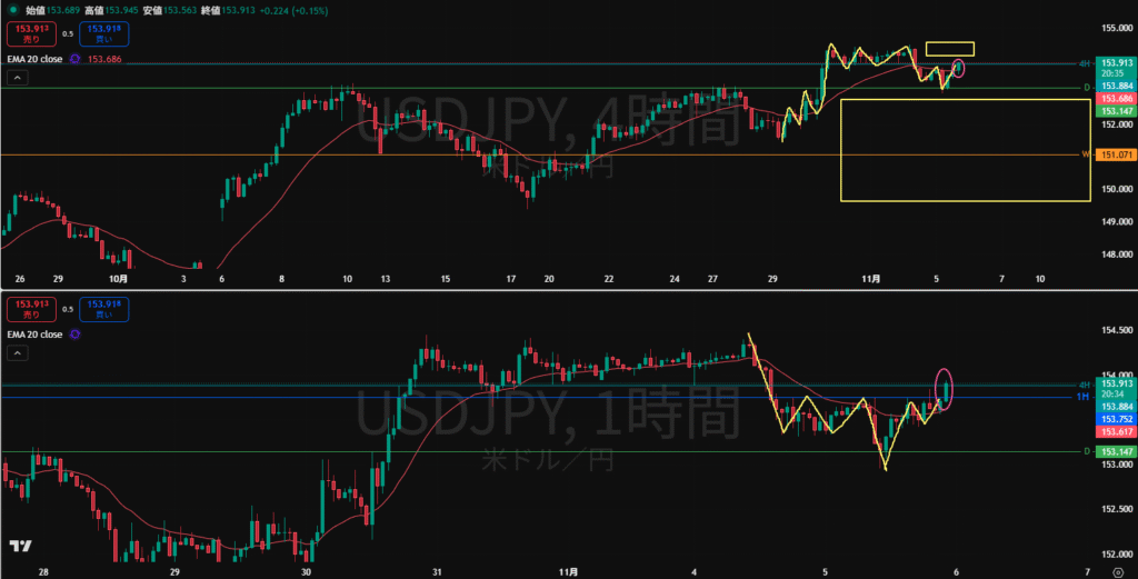 日足は押し目買いが入りやすい状況なのでそれを頭にいれつつも、日足の波のサイズが小さいこと、4H以下は下目線なので下落も考慮して視ていく。
