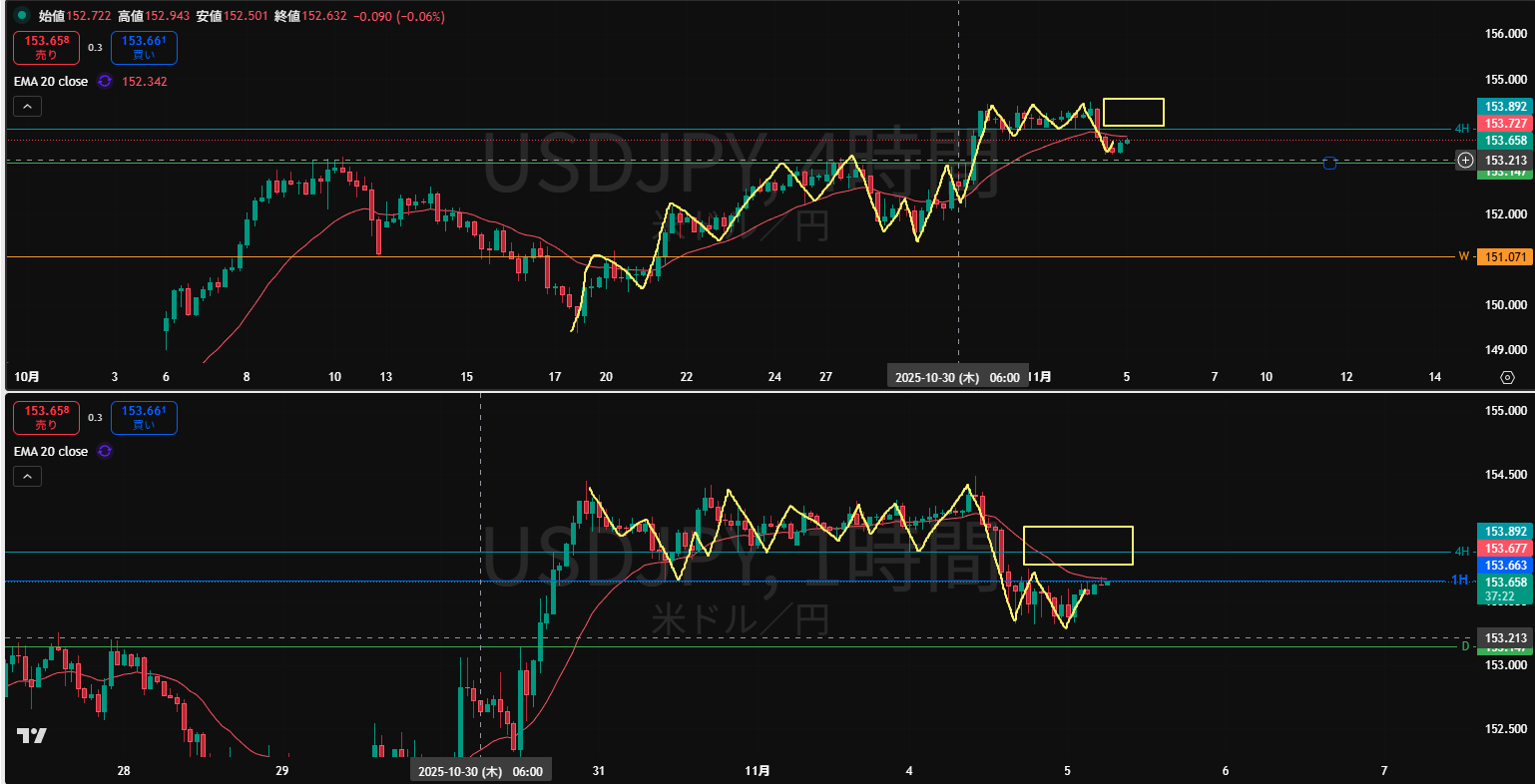 下目線だが、4Hの伸び切りリスクを考えると売りだけでなく買いも頭に入れて様子を視ていく。
