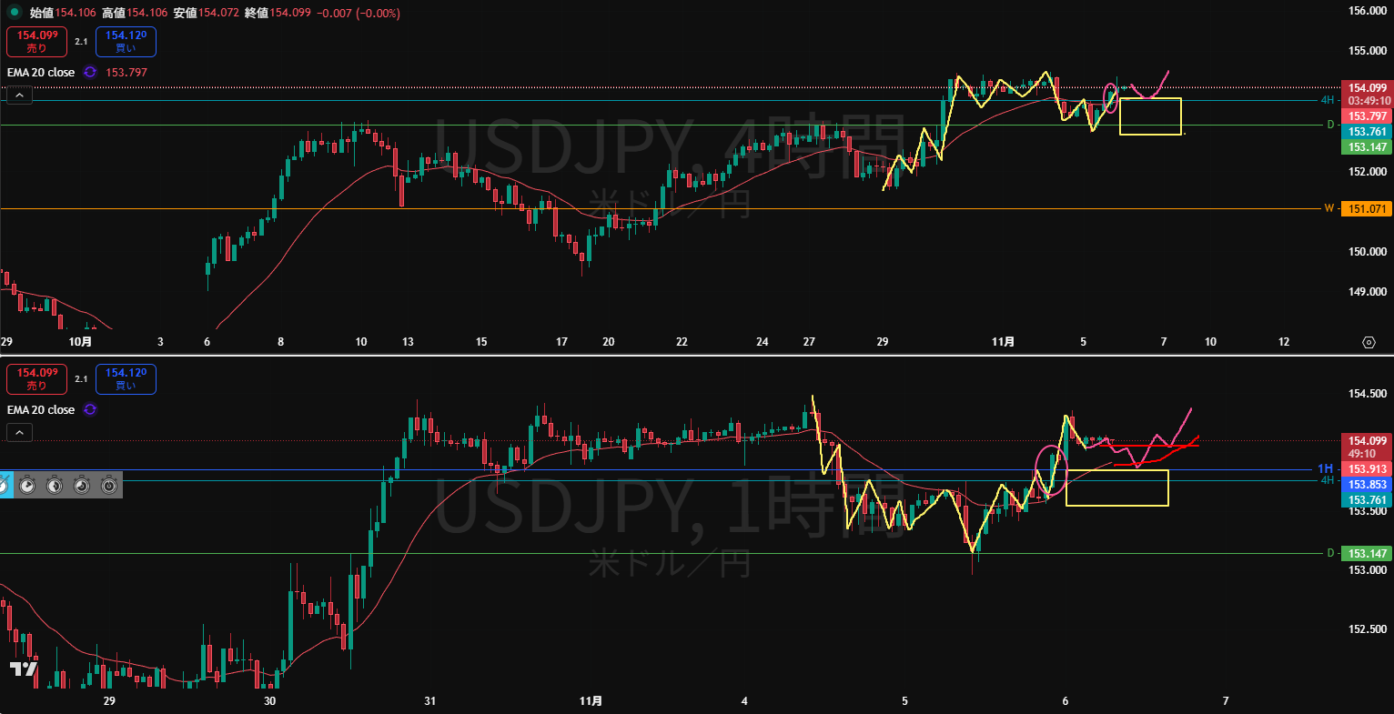 下目線だが、4Hの伸び切りリスクを考えると売りだけでなく買いも頭に入れて様子を視ていく。