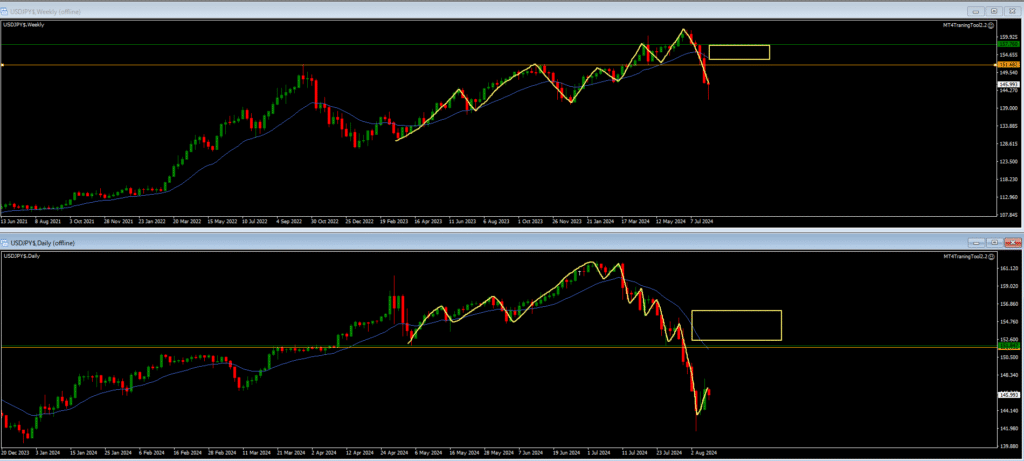 ・現在週足の安値、週足の安値、週足のMAを割って下落。月足の買い支えライン付近まで下落