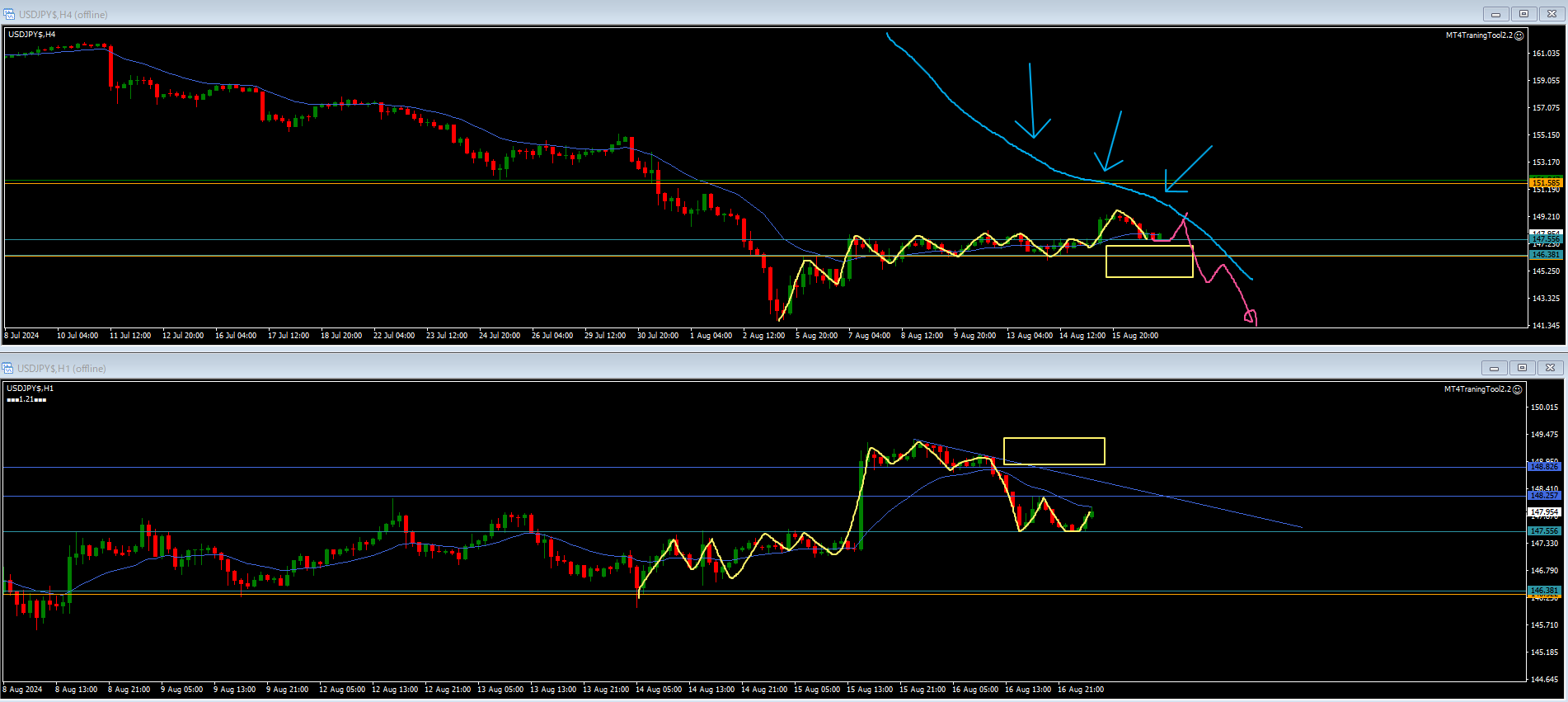 ・黄色四角には戻り売り勢力がいる。2番目のオレンジラインで止められ、押しを付けているところ