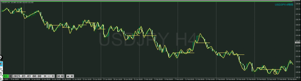 ・4Hの水平線(水色)は買い支えライン。日足の水平線に止められるように2度安値を止められてきている。