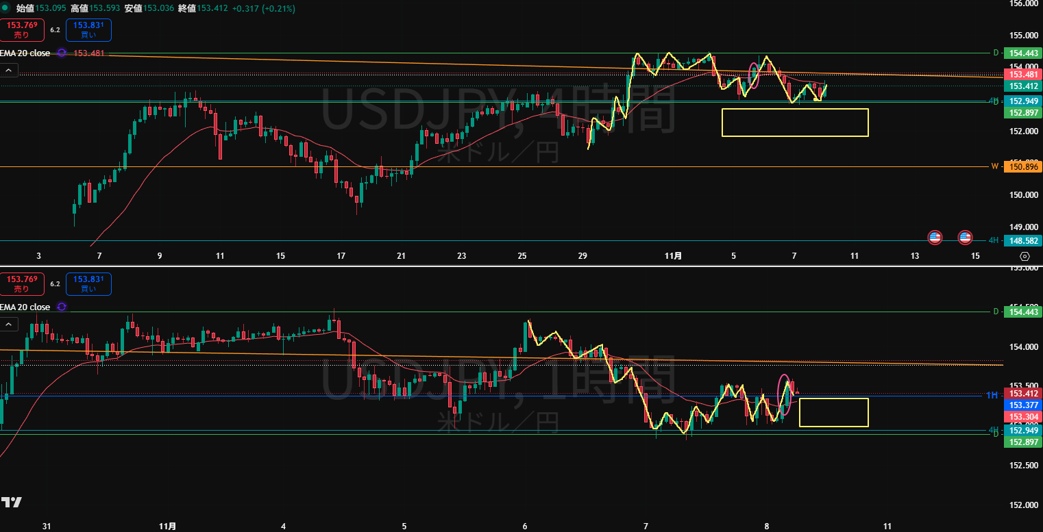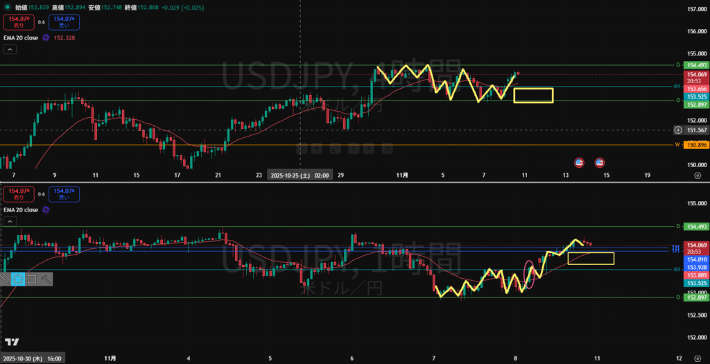 4H足では押し目買いを狙いたいところ。上には日足の戻り売りラインがあるので、4H水平線までしっかり押してくれば買いで検討。押しが浅ければスルー