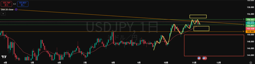 ・オレンジのラインは押し目買いライン。過去の高値2点を結んだライン付近に到達。日足を視ると止められてきているようにも見える。