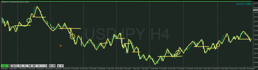 緑の水平線(押し目買いライン)では売りが入りやすい状況