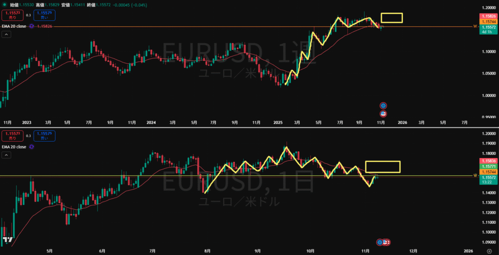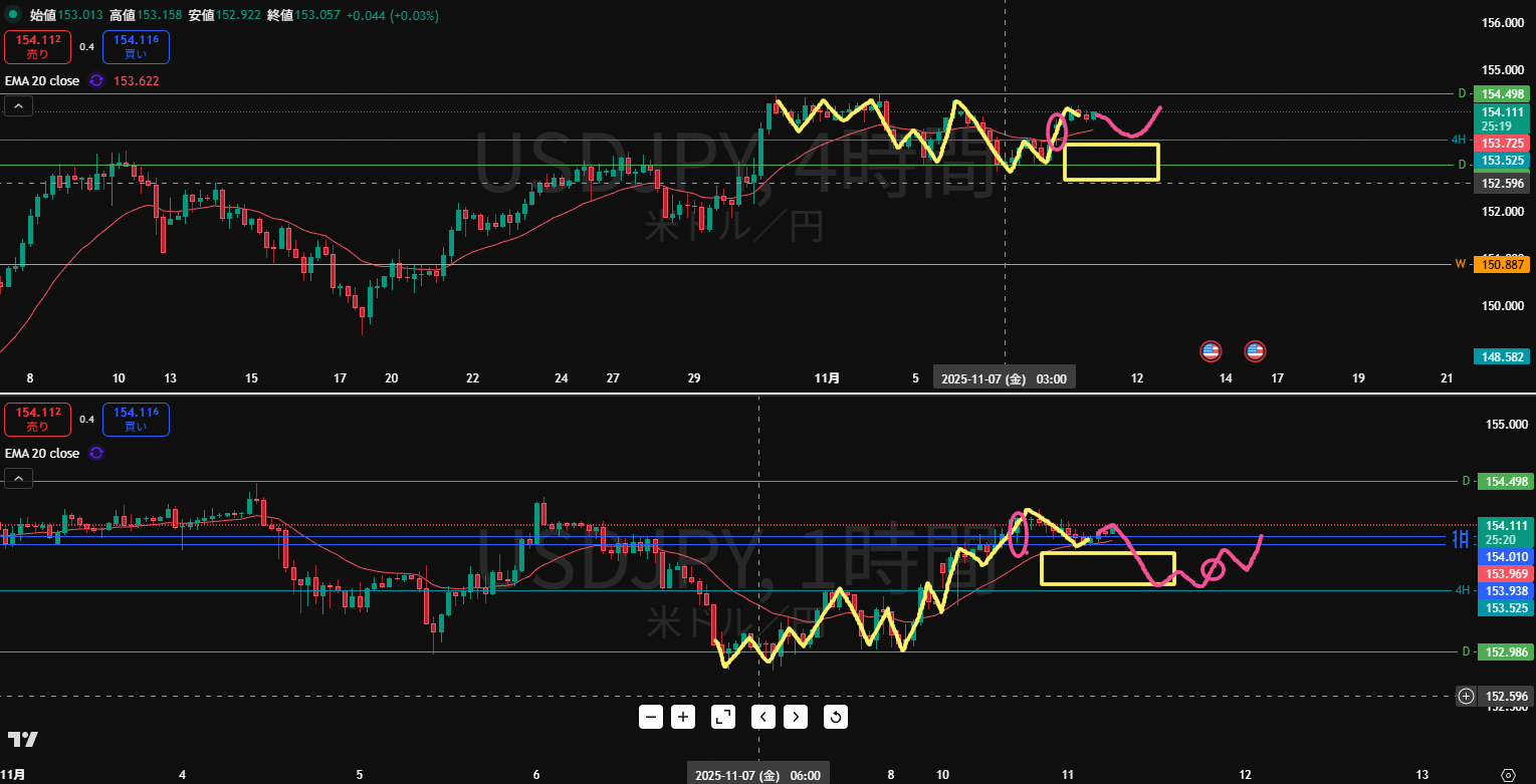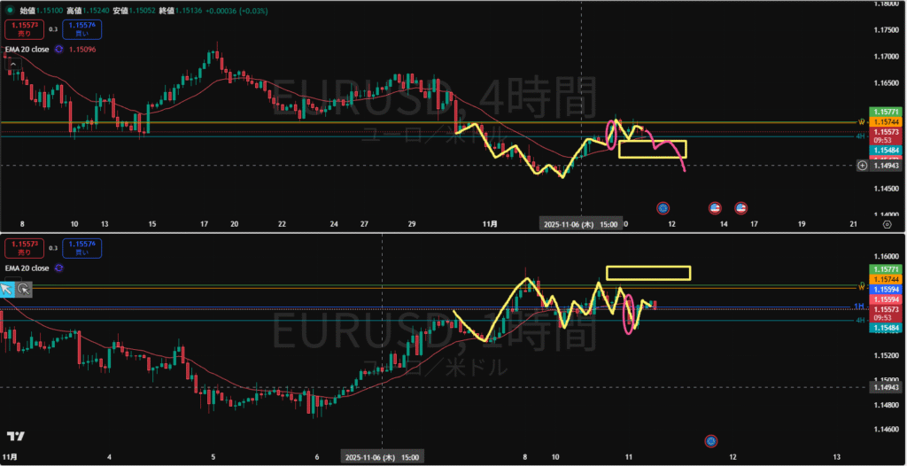 日足、週足の水平線が重なる1.157のレジスタンスはかなり強いと思われるので、4Hの目線は上だが買っていくのは厳しい。4Hが下降トレンドが出るまでは静観していく。