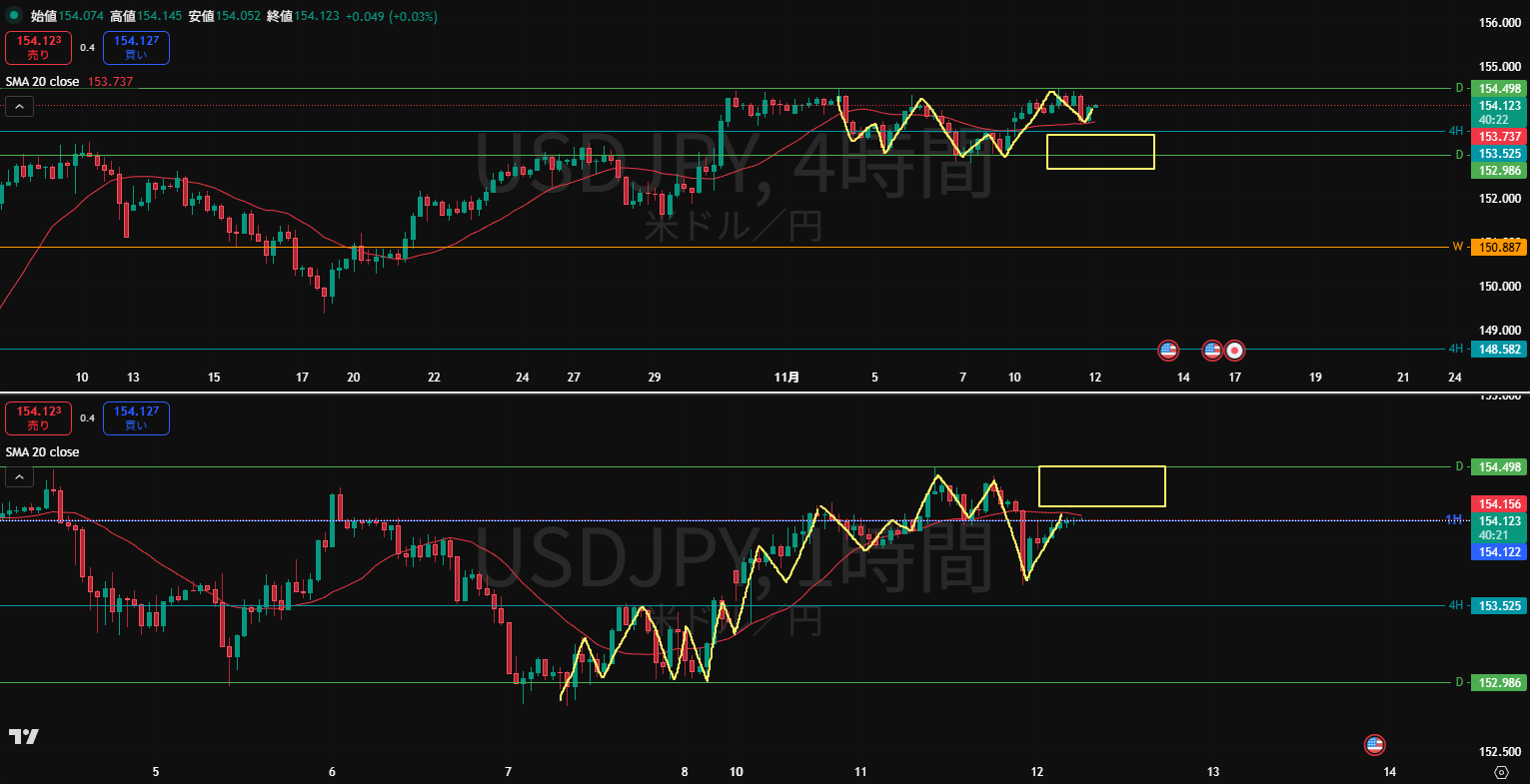 昨日の上昇では日足の売り抑えラインは超えてこられずだいぶ強いレジスタンスとなっている。ただ、4H足のMAに支えられるように止められ上昇してきている。日足のMAも再び上向いてきているので上への意識も強いと感じる。4H足の押し目買いラインまで落としてしまうとMAを下抜いてきてしまうので、そこからすぐは買えない。買うなら4H押し目買いラインまで押した後MAも上抜けるのを待つか、日足のレジスタンス抜けを待つか。どちらにしてももう少し様子見