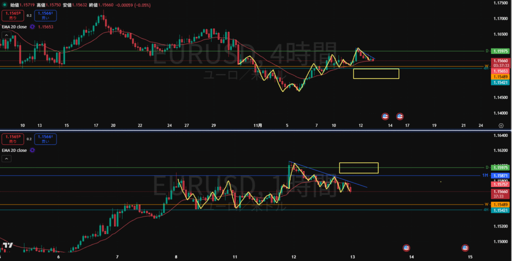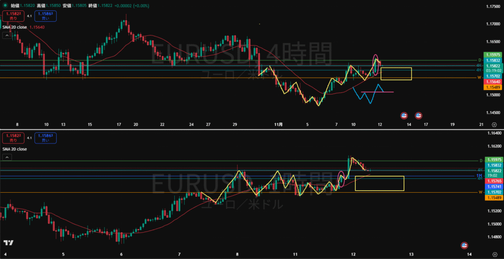 ・高値を切り下げて下落、MAも下抜いてきた。4H足のMAで反発上昇してきて1HMAに抑えられようかというところ