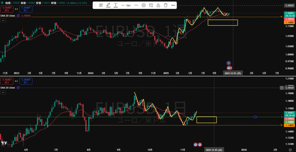 ・緑ラインは日足の押し目買いライン。黄色四角に押し目買い勢力がいる。高値を超えて上昇トレンド継続中
