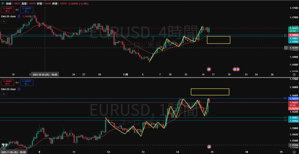 1Hが一度下降トレンドになって4Hの押し目買いラインまで落ちてから再度上昇トレンドになってくれば押し目買いで検討する。