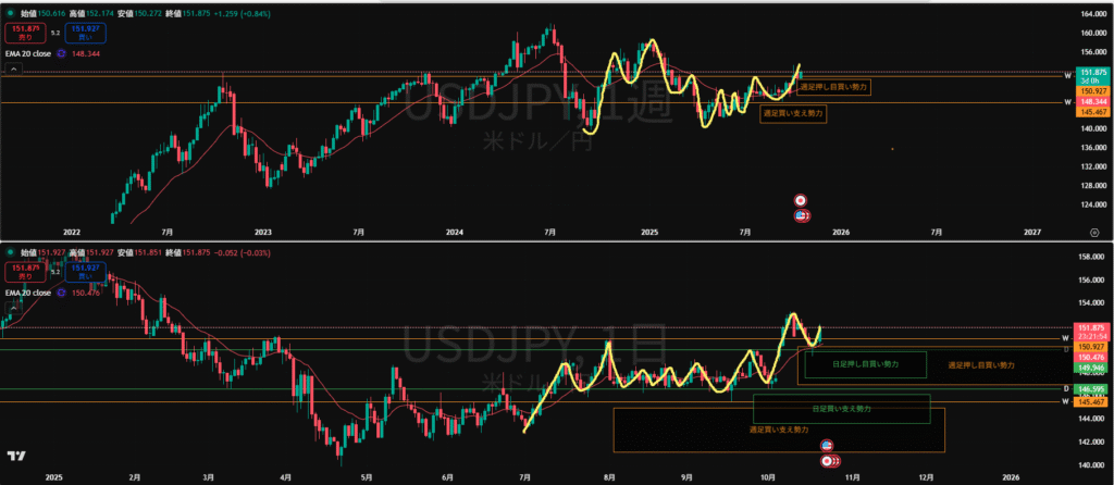 ・上位足(週足、日足)では波の方向、波の状態(根っこなのか、途中なのか、終わりそうなのか)、レジサポを見ていく。