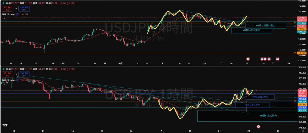 ・1H足ヨコヨコの状態。1H足の押し目買いラインの水平線と1H足に引いた水平線に挟まれるようにだいぶギュッとなってきているので、1H足のMAにも支えられてきて、斜めライン上抜ければそのまま上がっていく可能性もある。4H足的には押しが浅いので、しっかり押してくるまで待ちたい。