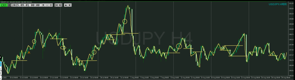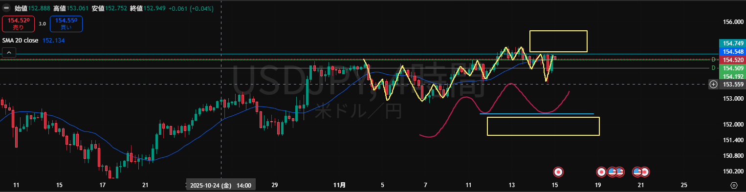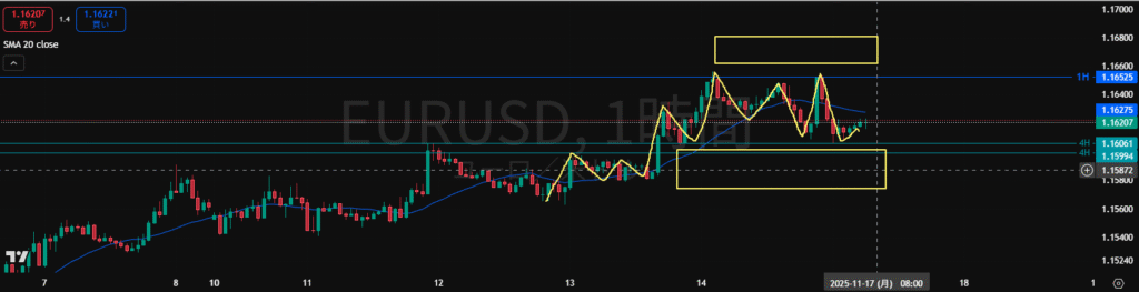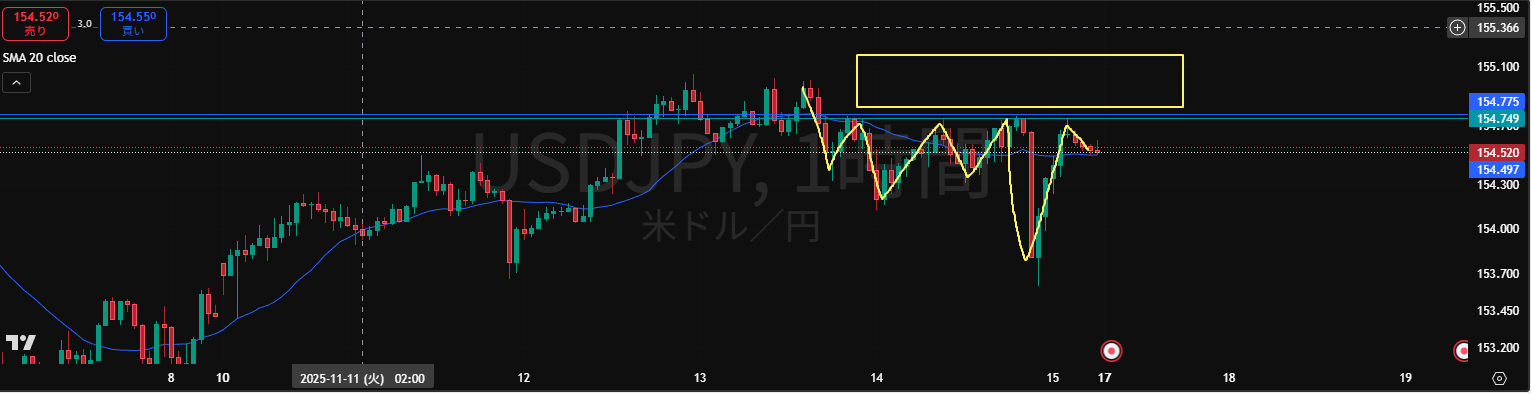 4H足を上方向では視ているものの、1H見ると積極的に買っていける状況ではないので様子を視ていく