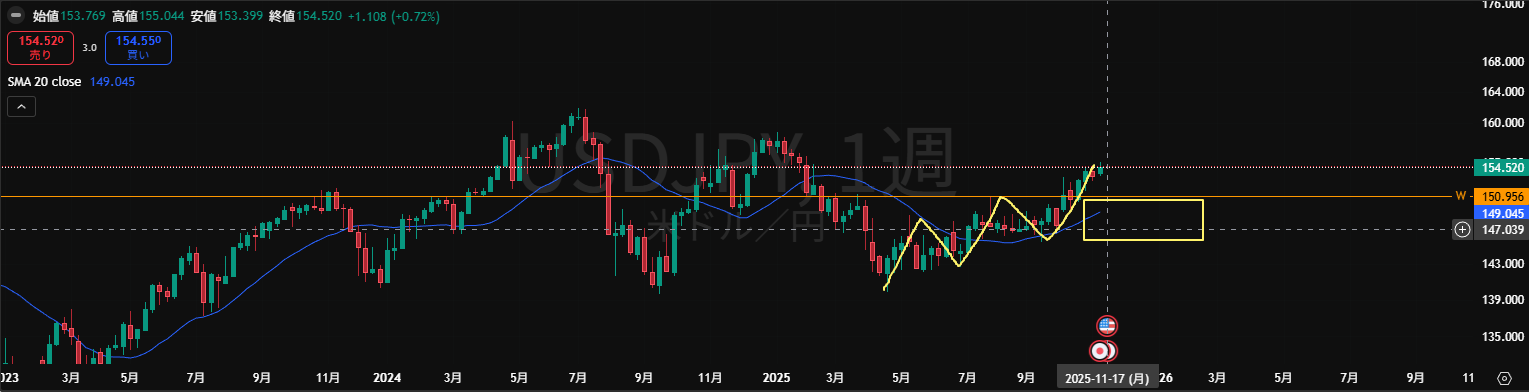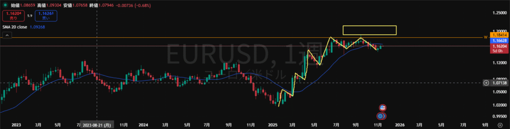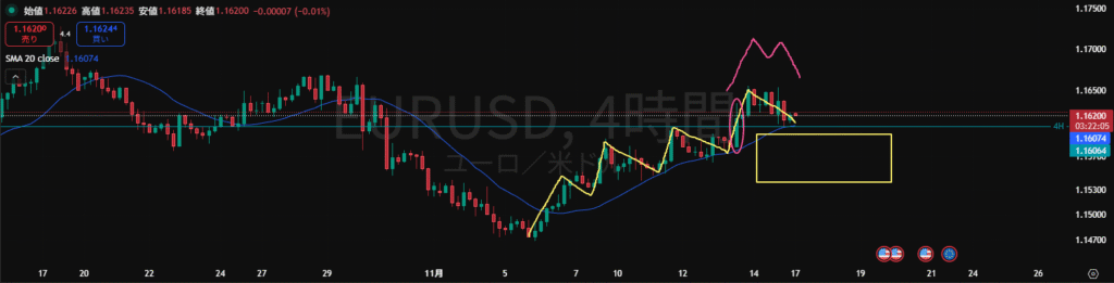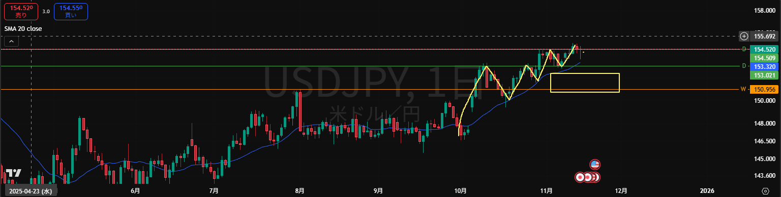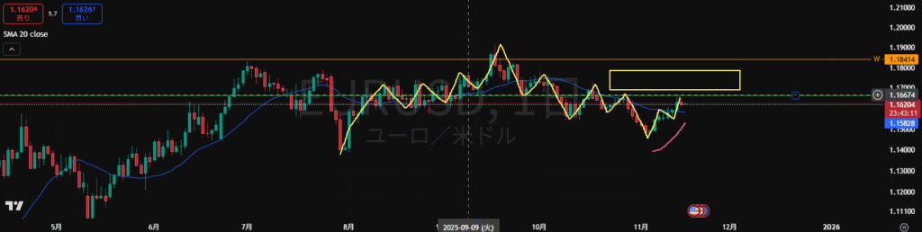 ・緑ラインが売り抑えライン。MAを上抜いていて買い支えられやすい状況。ダウが2通りあり、黄色ダウだと上昇トレンド中。ピンクダウだと下落の戻し過ぎ。週足はMAに抑えられようとしているところ、日足は買い支えられやすいところで値動きが難しくなりそうなのが考えられる。